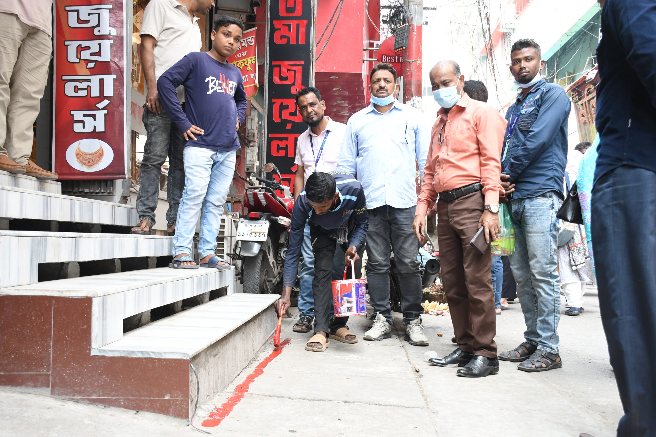 তাই লাল দাগ কেটে ব্যবসায়ীদের সতর্ক করা হয়েছে। এখন থেকে লাল দাগের বাইরে বাজার বসলে তাদের জরিমানা করা হবে।