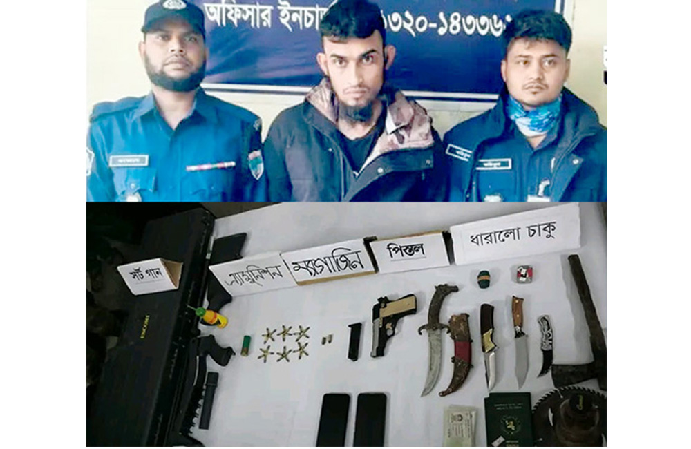 এ সময় তার হেফাজত থেকে একটি পিস্তল, একটি পিস্তল ম্যাগাজিন এবং ৩২ রাউন্ড পিস্তল অ্যামুনিশন, একটি শর্টগানের ব্যারেল, শর্টগান বাট স্টক, শর্টগান বুলেট, একাধিক মাজেল কাভার, বিপুল পরিমাণ খালি ও ব্যবহৃত কার্তুজ, একাধিক মোবাইল ফোন, মাদক সেবনে ব্যবহৃত সামগ্রি, চারটি চাকু, একটি কুড়াল, একটি ধারালো ব্রেলেট, উদ্ধার করা হয়।