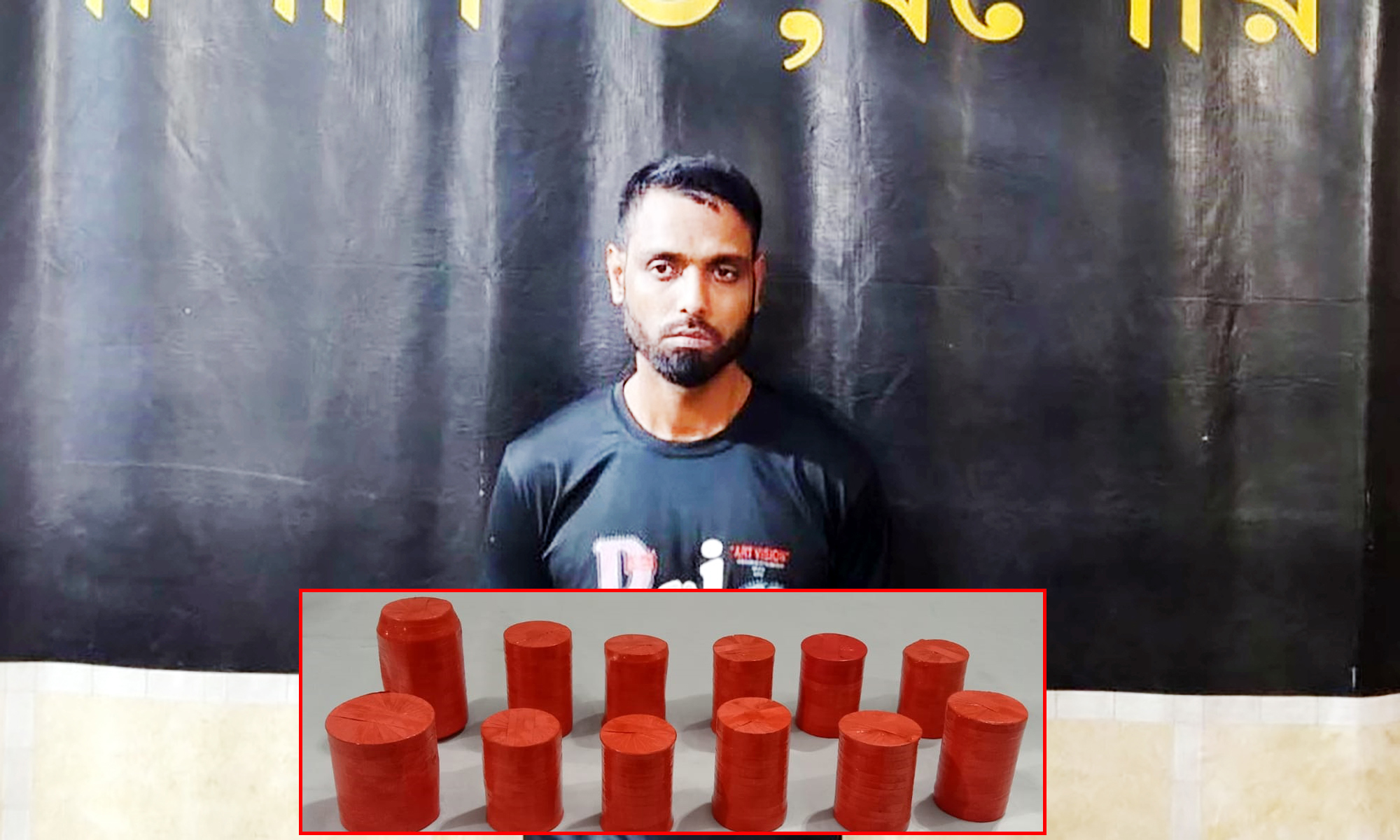 পরে উপস্থিত সাক্ষীদের সামনে তার কাছ থেকে লাল রঙের স্কচটেপ দিয়ে মোড়ানো ১২টি বোমা সদৃশ ককটেল উদ্ধার করা হয়। উদ্ধারকৃত আলামত জব্দ করা হয়েছে।