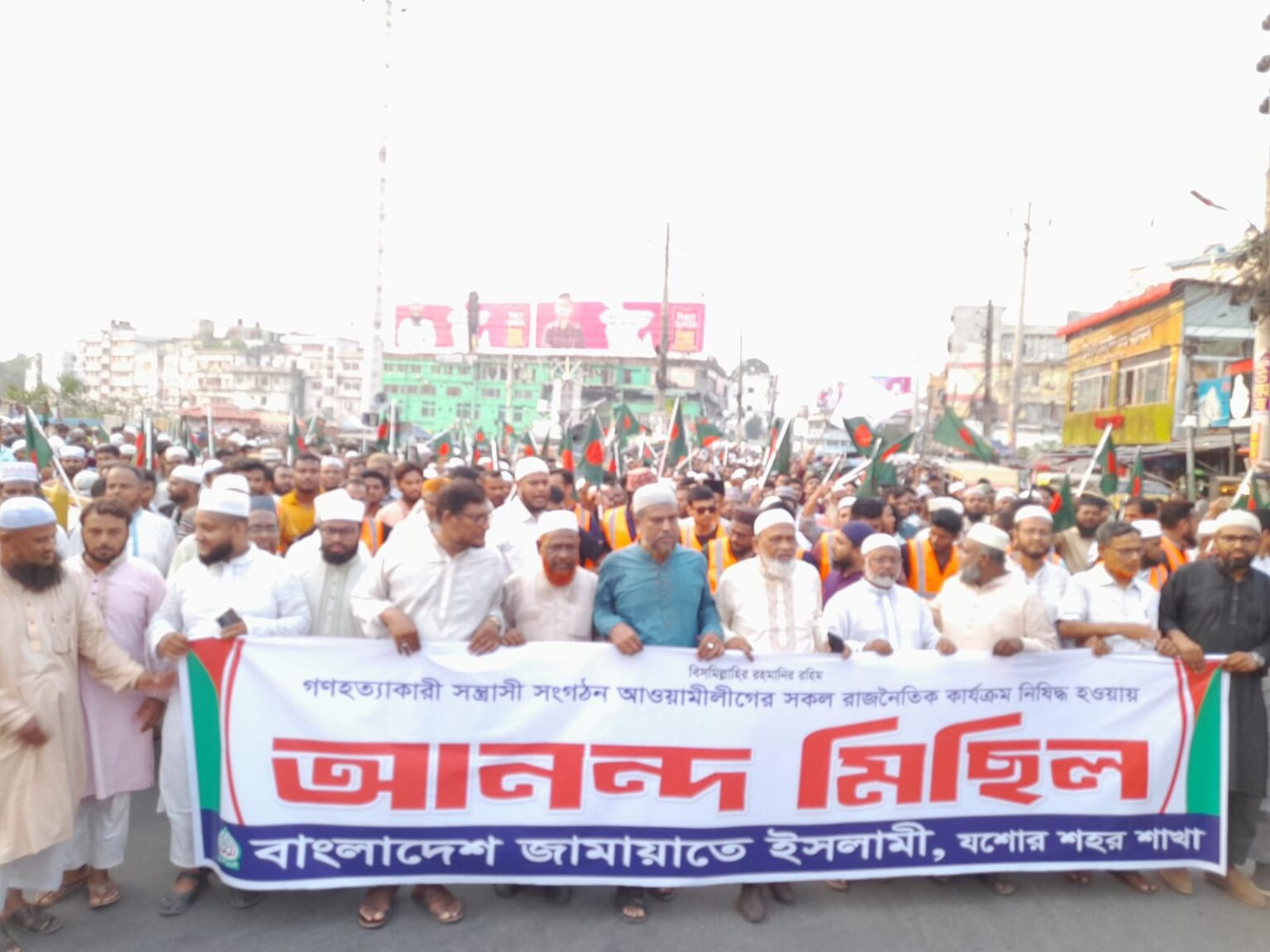 আওয়ামী লীগের রাজনীতিক কার্যক্রম নিষিদ্ধকরণে যশোরে সমাবেশ ও আনন্দ মিছিল করেছে জামায়াতে ইসলামীর নেতাকর্মীরা। সংগঠনটির যশোর শহর শাখার আয়োজনে আজ রবিবার বিকালে শহরের দড়াটানা ভৈরব চত্বরে এই সমাবেশ হয়। সমাবেশে থেকে নেতাকর্মীরা শহরে আনন্দ মিছিল বরেন করেন। জেলা জামায়াতে ইসলামীর আমীর অধ্যাপক গোলাম রসুলের নেতৃত্বে মিছিলটি শহরের প্রধান প্রধান সড়ক প্রদক্ষিণ করে মনিহার বাসস্ট্যান্ডে যেয়ে শেষ হয়।