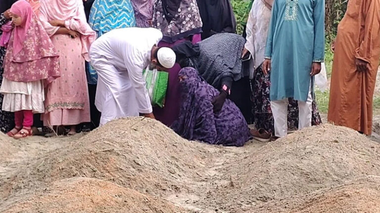 বাড়ির সামনে পড়ে আছে মসজিদ থেকে আনা কয়েকটি খাটিয়া। আঙিনায় গভীর নীরবতা। কিছুক্ষণ পর পর পরিবারের সদস্য ও স্বজনরা যাচ্ছেন কবরস্থানে। সেখানে গিয়ে প্রিয়জনদের কবরের পাশে দাঁড়িয়ে দোয়া করছেন, কেউ কেউ নিঃশব্দে কাঁদছেন কবরের মাটি ছুঁয়ে।
