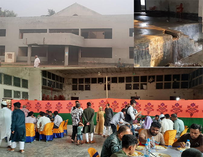 হলরুমের মেঝে ফুড়ে বের হচ্ছে ঝর্ণার মত পানি। চলেনা সিলিং ফ্যান। ছিদ্র হয়ে গেছে উপরের ছাউনির টিন। অস্বাস্থ্যকর ওয়াসরুমে গন্ধে ঢোকা দায়। ছিড়ে গেছে দেয়ালের শব্দ নিয়ন্ত্রক বক্স।