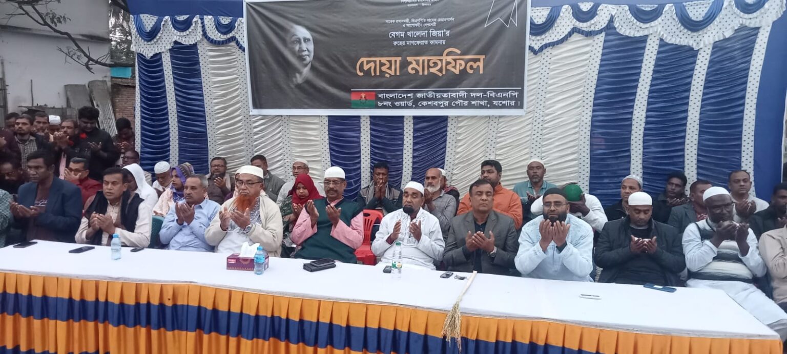 যশোরের কেশবপুরে বাংলাদেশ জাতীয়তাবাদী দল-বিএনপি’র চেয়ারপার্সন সাবেক প্রধানমন্ত্রী বেগম খালেদা জিয়ার রুহের মাগফেরাত কামনায় দোয়া মাহফিল অনুষ্ঠিত হয়েছে। বুধবার বিকেলে পৌর ৮নং ওয়ার্ড বিএনপি’র আয়োজনে কেশবপুর সরকারি পাইলট উচ্চ মাধ্যমিক বিদ্যালয়ের প্রাঙ্গণে ওই দোয়া মাহফিল অনুষ্ঠিত হয়।