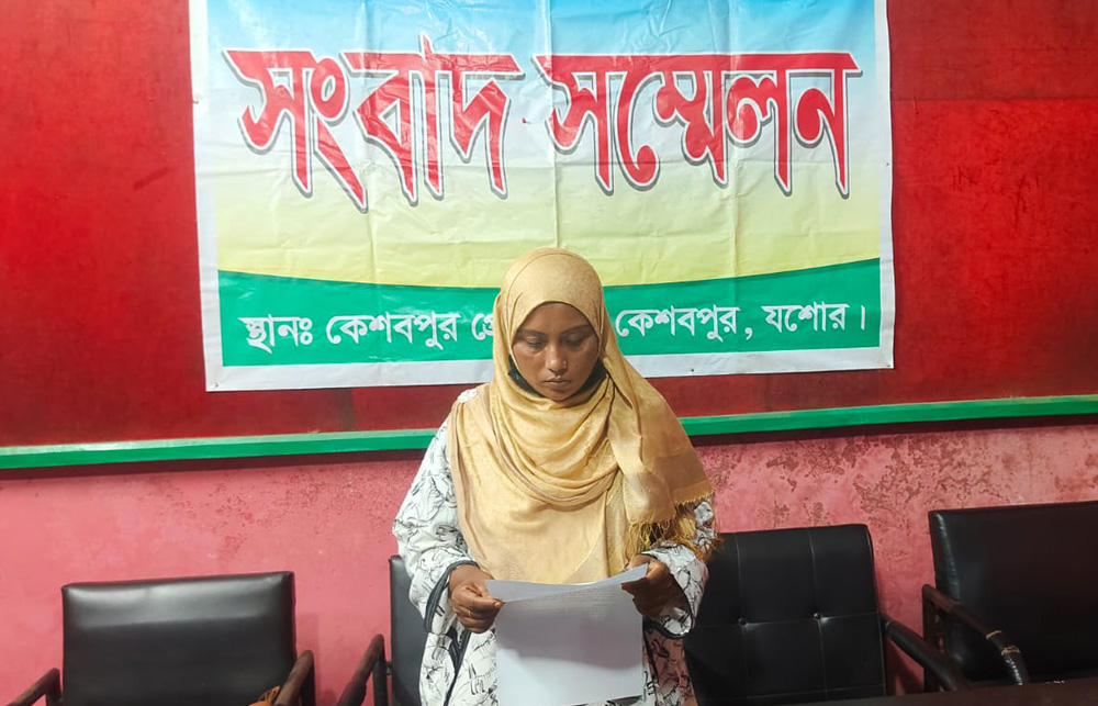 লিখিত বক্তব্য পাঠকালে মাহমুদা সুলতানা রেশমা বলেন, আমি একজন ডিভোর্সী মহিলা এবং ১০ বছরের ১টি পুত্র সন্তান আছে জানার পরও কেশবপুরের আবু শারাফ সাদেক কারিগরি ও বাণিজ্য মহাবিদ্যালয়ের গণিতের প্রভাষক রফিকুল ইসলাম আমার সাথে সখ্যতা তৈরি করেন। সে সুবাদে তার স্ত্রী অসুস্থ থাকার কথা বলে আমার সাথে গভীর সম্পর্ক গড়ে তুলে বিয়ের প্রস্তাব দেয়। একপর্যায়ে আমার পরিবারের লোকজনের সম্মতিতে ২০২৫ সালের ২৭ ডিসেম্বর রেজিস্ট্রি কাবিনমূলে বিয়ে করে। বিয়ের পর কিছুদিন সংসার করে ১ ভরি ওজনের স্বর্ণের ১টি চেইন, দেড় ভরি ওজনের স্বর্ণের বালা ২টি, ১০ আনা ওজনের স্বর্ণের আংটি ২টি জোর পূর্বক ছিনিয়ে নিয়ে এক বস্ত্রে বাড়ি থেকে তাড়িয়ে দেয়।