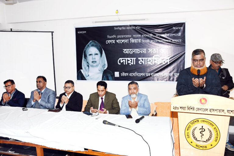 যশোর ২৫০ শয্যা বিশিষ্ট জেনারেল হাসপাতালে সাবেক প্রধানমন্ত্রী, গণতান্ত্রিক আন্দোলনের প্রতীক বাংলাদেশ জাতীয়তাবাদী বিএনপির চেয়ারপারসন বেগম খালেদা জিয়ার মৃত্যুতে আলোচনা সভা ও দোয়া মাহফিল অনুষ্ঠিত হয়েছে। শনিবার দুপুরে হাসপাতালের কনফারেন্স রুমে এ অনুষ্ঠানের আয়োজন করে বিএনপিপন্থী চিকিৎসকদের সংগঠন ডক্টরস এসোসিয়েশন অব বাংলাদেশ (ড্যাব) যশোর।