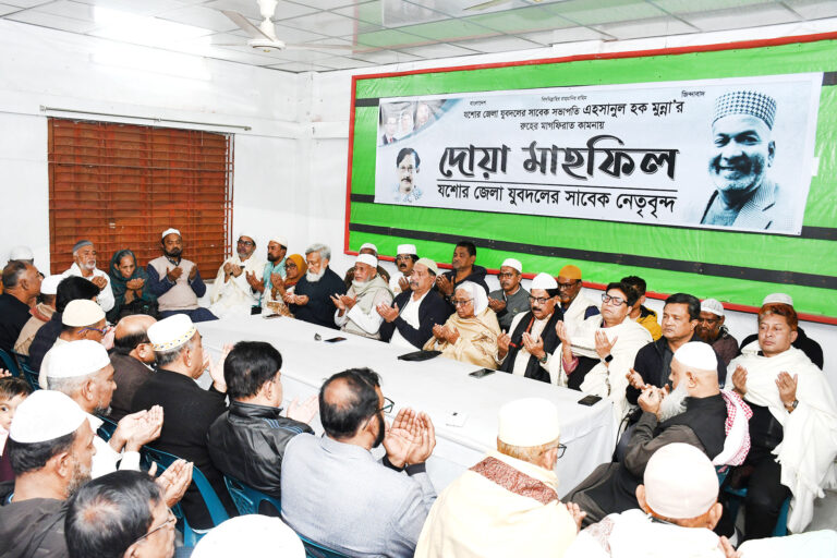 যশোর জেলা যুবদলের সাবেক সভাপতি এহসানুল হক মুন্নার আত্মার মাগফিরাত কামনায় দোয়া মাহফিল পূর্ব সংক্ষিপ্ত বক্তৃতায় তিনি এ কথা বলেন। সাবেক জেলা যুবদলর নেতৃবৃন্দের আয়োজনে শুক্রবার জেলা বিএনপি কার্যালয়ে দোয়া মাহফিল অনুষ্ঠিত হয়। এ সময় অধ্যাপক নার্গিস বেগম আরও বলেন, অত্যান্ত কঠিন সময় এহসানুল হক মুন্নার দলে আগমন ঘটে। যখন শামরিক শাসনে দেশ বিধ্বস্ত দেশ, তখন মুন্না জীবনের ঝুঁকি নিয়ে রাজপথে নেমে আসেন। সৈ¦রাচারের বিরুদ্ধে অনেক সাহসীকতার পরিচয় দেন। সেই সময় সারা দেশে যারা যুবদল ছাত্রদলের রাজনীতি করতো তারা সকলেই জীবনের মায়া ত্যাগ করে রাজনীতি করতো এহসানুল হক মুন্নার তাদের মধ্যে একজন। গণতন্তের জন্য রাজপথে হৃদয় দিয়ে শেখ হাসিনার তপ্ত বুলেট ধারণ করেছেন। অসুস্থ শরীর নিয়ে ফ্যাসিস্ট আওয়ীমী লীগে নির্যাতন থেকে রেহাই পাননি। গুরুতর অসুস্থ অবস্থায় তাকে মিথ্যা মামলায় কারা বরণ করতে হয়েছে। আমৃত্যু দলের নীতি আদর্শ দর্শন লালন করেছেন। মুন্না সকলের জন্য অনুকরণীয় দৃষ্টান্ত হয়ে থাকবে।