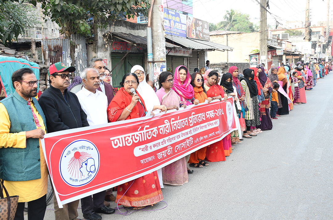 “নারী ও কন্যার প্রতি সহিংসতা বন্ধে ঐক্যবদ্ধ হই, ডিজিটাল নিরাপত্তা নিশ্চিত করি’ স্লোগানে এই মানববন্ধনের আয়োজন করে দক্ষিণবঙ্গে বঞ্চিত নারী ও শিশুদের নিয়ে কাজ করা প্রতিষ্ঠান ‘জয়তী সোসাইটি’। বিভিন্ন স্লোগান সম্বলিত প্লেকার্ড নিয়ে আধাকিলোমিটার সড়ক ধরে এই মানববন্ধনে অংশ নেন যশোর শহরের প্রায় ৪ হাজার বিভিন্ন বয়সী নারী।