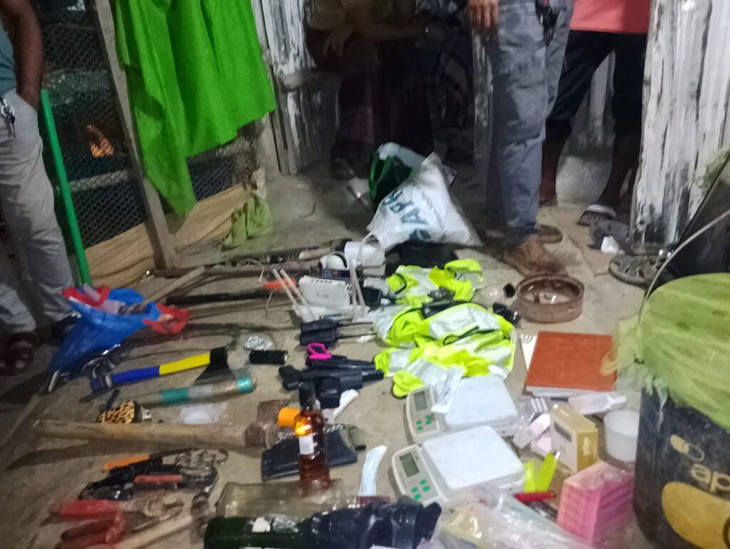 উজেলার পুরন্দরপুর গ্রামের আজিজ ড্রাইভারের ছেলে সোহাগের হাঁসের খামারে অভিযানকালে সেখান থেকে ঝিকরগাছার পারবাজারের হাসিবুল (২৮), কাউরিয়া মুন্সী পাড়া গ্রামের মাহাবুবুর রহমান (৩৬), মণিরামপুরের ঝাঁপা গ্রামের ইউনুস আলি (২৫) এবং শিমুলকে (২৭) আটক করা হয়। এ সময় পুলিশের উপস্থিতি টের পেয়ে সোহাগ (৩৬) পালিয়ে যান। অভিযানকালে সেখান থেকে চাইনিজ কুড়াল, খেলনা পিস্তল, লোহার শাবল, ওয়াকিটকি, ডিজিটাল ওজন মাপা যন্ত্র, লোহা কাটা করাত, জ্যাকেটসহ ডাকাতি কাজে ব্যবহৃত বিভিন্ন সরঞ্জাম উদ্ধার হয়।