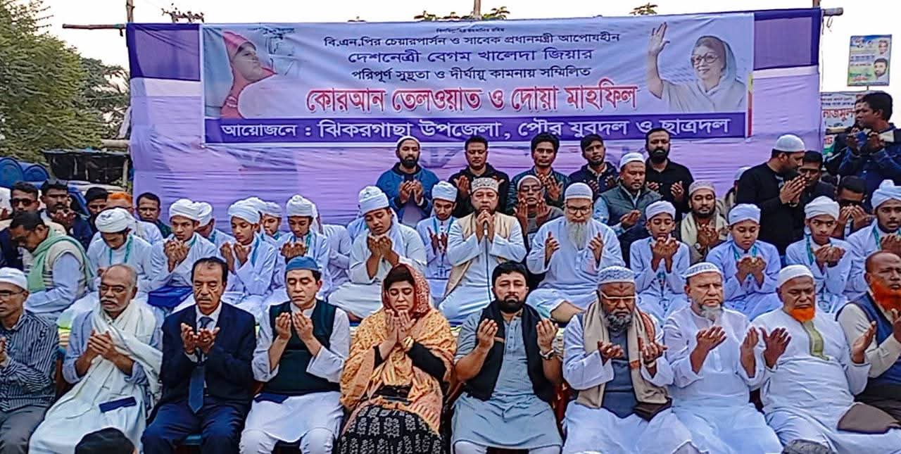 যশোরের ঝিকরগাছায় বিএনপি চেয়ারপার্সন ও সাবেক প্রধানমন্ত্রী আপোসহীন দেশনেত্রী বেগম খালেদা জিয়ার পরিপূর্ণ সুস্থতা ও দীর্ঘায়ু কামনায় সম্মিলিত কোরআন তেলাওয়াত ও দোয়া মাহফিল অনুষ্ঠিত হয়েছে।