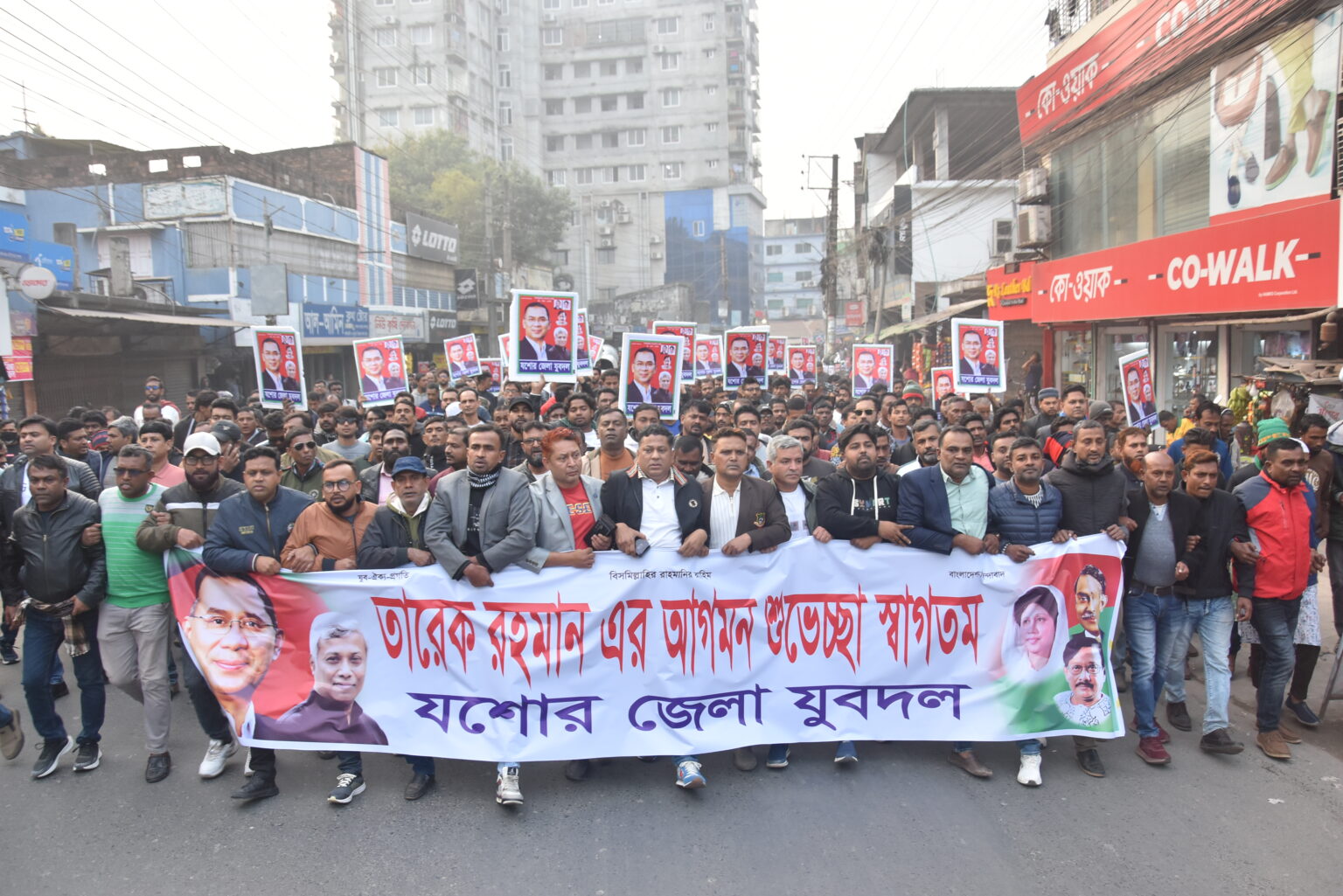 বিএনপির ভারপ্রাপ্ত চেয়ারম্যান তারেক রহমানের আগমনকে স্বাগত জানিয়ে শুভেচ্ছা মিছিল করেছে যশোর জেলা যুবদল।