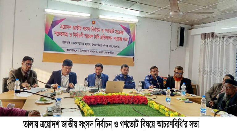 আসন্ন ত্রয়োদশ জাতীয় সংসদ নির্বাচন ও গণভোটকে সামনে রেখে ভোটারদের সচেতনতা বৃদ্ধি এবং নির্বাচনী আচরণবিধি যথাযথভাবে প্রতিপালনের লক্ষ্যে তালায় সচেতনতামূলক সভা অনুষ্ঠিত হয়েছে।