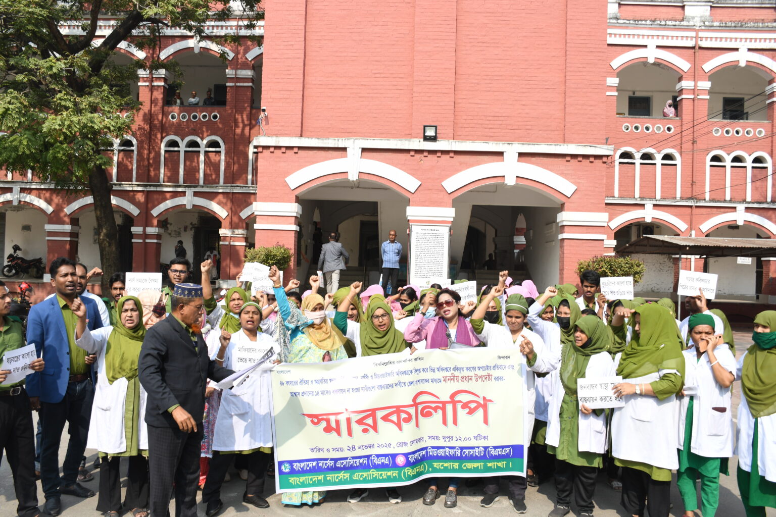 নার্সিং ও মিডওয়াইফারি অধিদপ্তরকে বিলুপ্ত করে ভিন্ন অধিদপ্তরের সঙ্গে একীভূত করার প্রস্তাবের প্রতিবাদে যশোরে মানববন্ধন ও স্মারকলিপি প্রদান কর্মসূচি অনুষ্ঠিত হয়েছে। কেন্দ্রীয় কর্মসূচির অংশ হিসেবে সোমবার দুপুর ২টা থেকে আড়াইটা পর্যন্ত যশোর ২৫০ শয্যা বিশিষ্ট জেনারেল হাসপাতালের প্রশাসনিক ভবনের সামনে বাংলাদেশ নার্সেস এসোসিয়েশন (বিএনএ) যশোর জেলা শাখা এই কর্মসূচি পালন করে।
