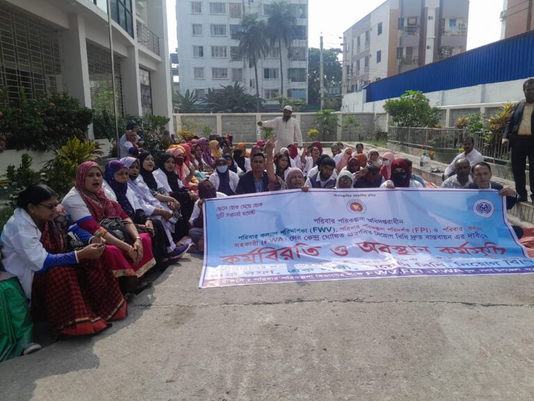 অবস্থান কর্মসূচি চলাকালে নেতৃবৃন্দ বলেন, সারা দেশে ৩৩ হাজার ৭১০ জন কর্মরত বিভিন্ন পদধারীরা জনসংখ্যা নিয়ন্ত্রণে পরিবার পরিকল্পনা সেবা, শতভাগ দম্পতি নিবন্ধন এবং নিয়মতি বাড়ি বাড়ি গিয়ে স্বাস্থ্যসেবা দিয়ে আসছেন।