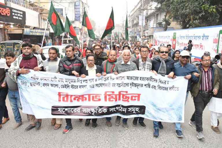 • ‘পরিকল্পিত সন্ত্রাসবাদী’ হামলা, ভাঙচুর ও অগ্নিসংযোগের প্রতিবাদে যশোরে বিক্ষোভ মিছিল ও সমাবেশ