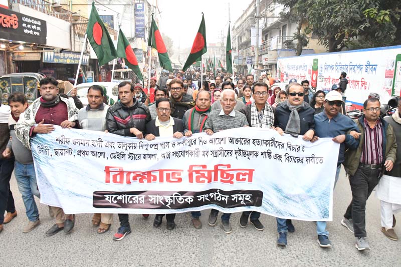 এসব ঘটনার সুস্থ তদন্ত ও বিচার দাবি করা হয় সমাবেশ থেকে। যশোর শিল্পকলার সাবেক সাধারণ সম্পাদক অ্যাডভোকেট মাহমুদ হাসান বুলু, বৈষম্য বিরোধী ছাত্র আন্দোলন যশোরের সাবেক নেতা ইমরান খান প্রমুখ বক্তব্য রাখেন। সমাবেশ শেষে বিক্ষোভ মিছিল বের করা হয়। মিছিলে জাতীয় পতাকা হাতে নিয়ে সমাবেশে যোগ দেয়া বিভিন্ন শ্রেণী পেশার মানুষ অংশ নেন। মিছিল থেকে স্লোগান দেয়া হয়। মিছিলটি চিত্রার মোড় দড়াটানা মোড় ঘুরে আবার টাউন হল মাঠে এসে শেষ হয়।