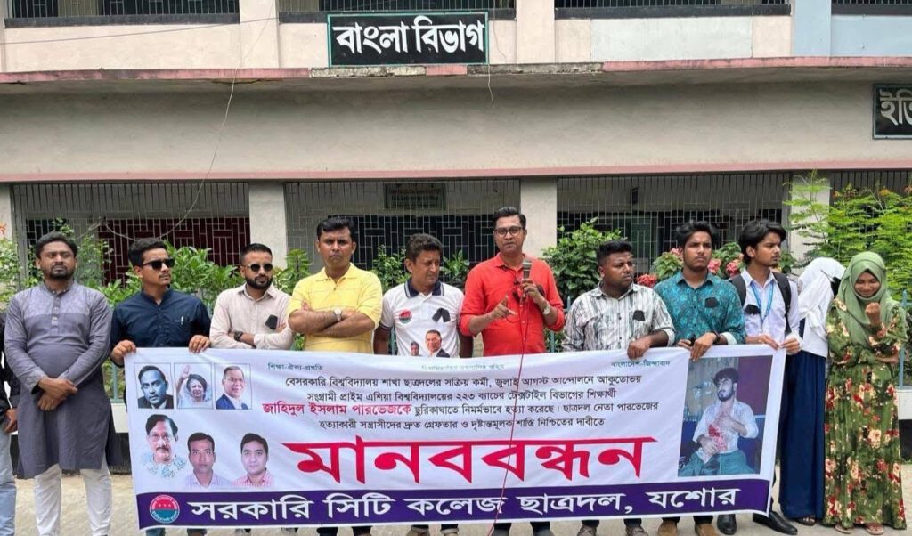 সোমবার সকালে সরকারি মাইকেল মধুসূদন কলেজ ক্যাম্পাসে চেতনার চিরঞ্জীব ভাস্কর্যের পাদদেশে এই কর্মসূচি পালন করা হয়। মানববন্ধনে বক্তারা ছাত্রদল নেতা জাহিদুল হাসান পারভেজের হত্যাকারীদের দ্রুত গ্রেফতার, দৃষ্টান্তমূলক বিচার ও শাস্তি দাবি করেন। এ সময় তারা আরও উল্লেখ করেন ভবিষ্যতে যেন এ রকম ঘটনার আর পুনরাবৃত্তি না হয়।