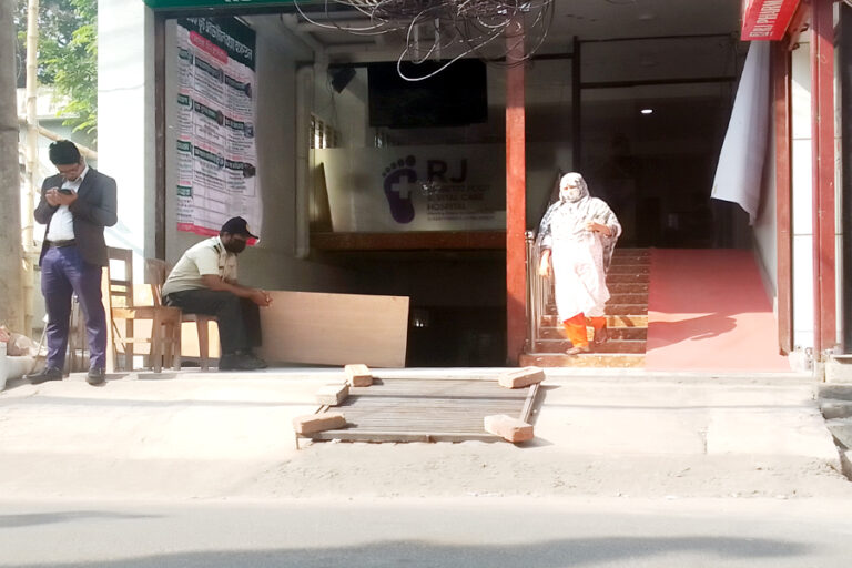 আর জে ডায়াবেটিক ফুট এন্ড ভাইটাল কেয়ার হাসপাতাল কর্তৃপক্ষ পৌরসভার ড্রেনের ওই স্লাব সরিয়ে মানুষ ও যান চলাচলের জন্য পাকাপোক্তভাবে নিজস্ব সিঁড়ি নির্মাণ করেছেন।