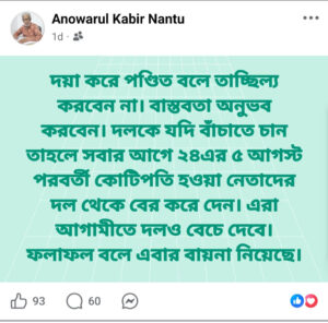 আনোয়ারুল কবির নান্টু তার ফেসবুক প্রোফাইলে লিখেন, “দয়া করে পণ্ডিত বলে তাচ্ছিল্য করবেন না। বাস্তবতা অনুভব করবেন। দলকে যদি বাঁচাতে চান তাহলে সবার আগে ২৪-এর ৫ আগস্ট পরবর্তী কোটিপতি হওয়া নেতাদের দল থেকে বের করে দেন। এরা আগামীতে দলও বেঁচে দেবে। ফলাফল বলে এবার বায়না নিয়েছে।”