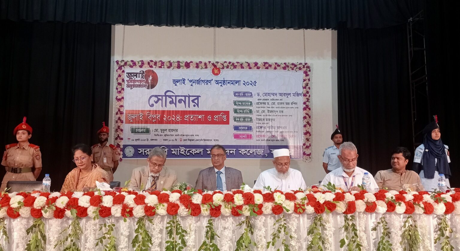 সরকারি মাইকেল মধুসূদন কলেজ(এমএম কলেজ) আয়োজিত ‘জুলাই বিপ্লব ২০২৪: প্রত্যাশা ও প্রাপ্তি’ শীর্ষক সেমিনার অনুষ্ঠিত হয়েছে। মঙ্গলবার সকালে জেলা শিল্পকলা একাডেমি মিলনায়তনে এই সেমিনার অনুষ্ঠিত হয়।