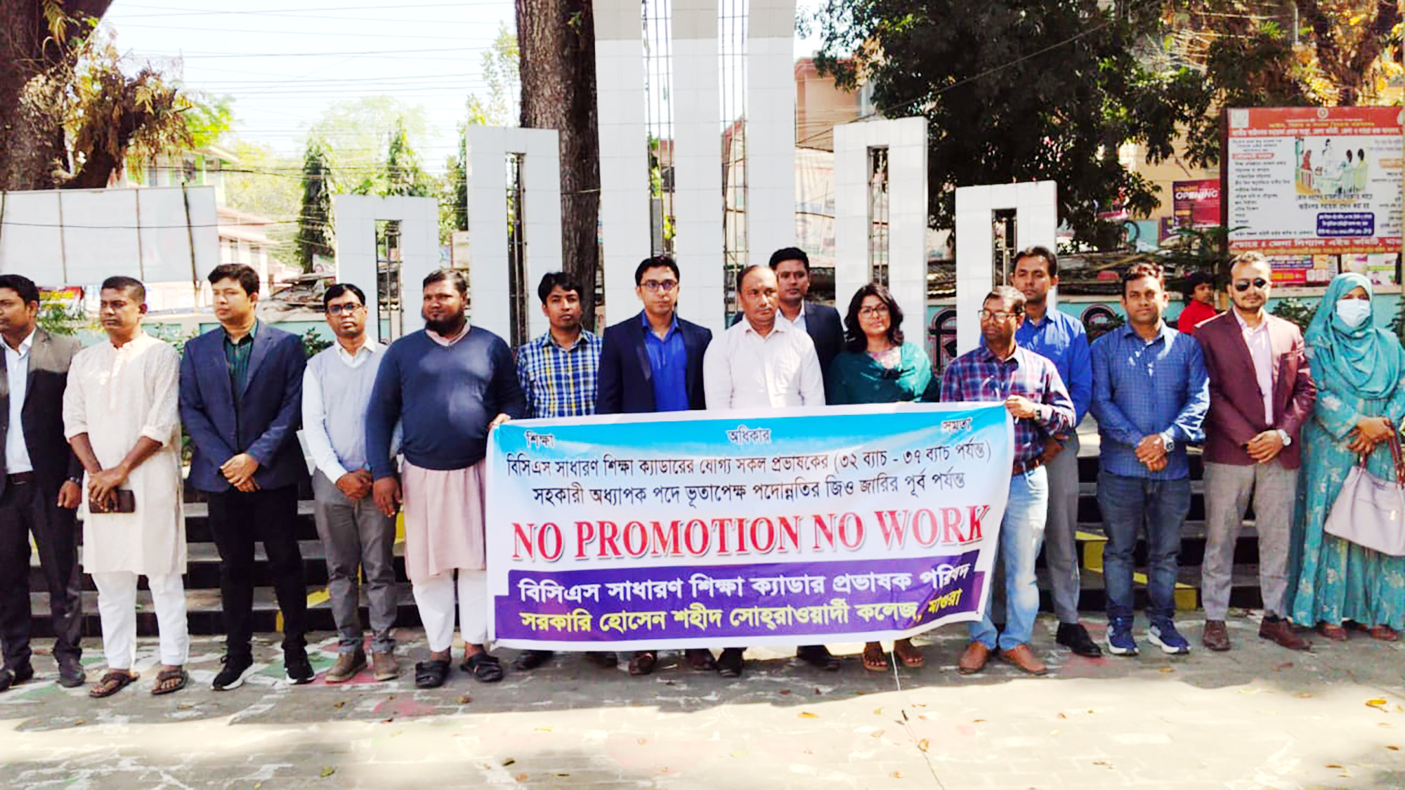 বিসিএস সাধারণ শিক্ষা ক্যাডারের যোগ্য প্রভাষকদের ভূতাপেক্ষ পদোন্নতি জিও জারির দাবিতে সারা দেশের মতো মাগুরাতেও ‘ নো প্রমোশন নো ওয়ার্ক’ কর্মসূচি পালিত হয়েছে। বৃহস্পতিবার বেলা ১১টায় সরকারি হোসেন শহীদ সোহরাওয়ার্দী কলেজের শহীদ মিনার চত্বরে প্রভাষক পরিষদের ব্যানারে এ কর্মসূচি অনুষ্ঠিত হয়।