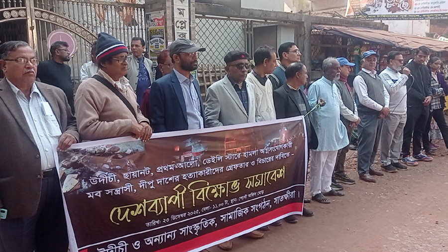 উদীচি, ছায়ানট, প্রথম আলো, ডেইলি স্টারে হামলা এবং দীপু দাশের হত্যাকারীদের গ্রেফতার ও বিচারের দাবিতে দেশব্যাপি বিক্ষোভ সমাবেশের অংশ হিসেবে মঙ্গলবার বেলা ১১ টায় সাতক্ষীরা পোস্ট অফিস মোড়ে উদীচি ও অন্যান্য সাংস্কৃতিক, সামাজিক সংগঠন সাতক্ষীরার আয়োজন মানববন্ধন অনুষ্ঠিত হয়।