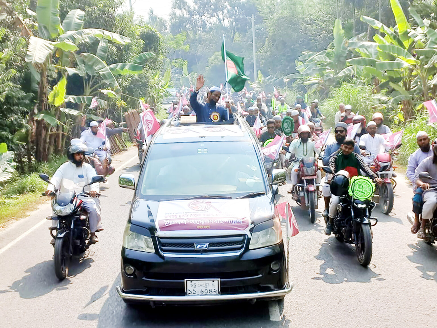 মোটরসাইকেল শোভাযাত্রার মাধ্যমে নেতৃবৃন্দ জনগণের মাঝে দলের প্রতীক হাতপাখা পরিচিতি ও পরিবর্তনের বার্তা তুলে ধরেন।