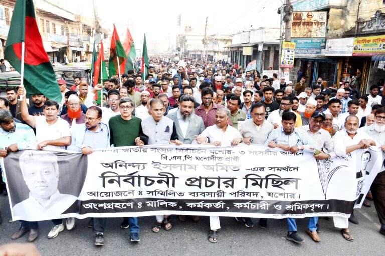 যশোর সদর আসনের বিএনপি মনোনীত প্রার্থী অনিন্দ্য ইসলাম অমিতের পক্ষে নির্বাচনী প্রচার মিছিল করেছে সম্মিলিত ব্যবসায়ী পরিষদ। রোববার বিকেলে শহরের মনিহার এলাকা থেকে এ প্রচার মিছিল বের হয়ে বিভিন্ন গুরুত্বপূর্ণ সড়ক প্রদক্ষিণ করে টাউন হল ময়দানে এসে শেষ হয়।