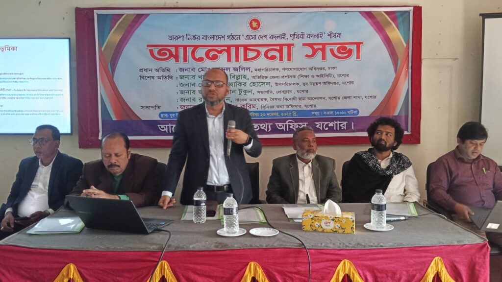 তারুণ্যনির্ভর বাংলাদেশ গঠনে ‘এসো দেশ বদলাই, পৃথিবী বদলাই’ শীর্ষক আলোচনা জেলা তথ্য অফিসের উদ্যোগে রবিবার সকালে যশোর যুব উন্নয়ন অধিদফতর মিলনায়তনে আলোচনা সভা অনুষ্ঠিত হয়েছে। এতে গণযোগাযোগ অধিদপ্তর ঢাকার মহাপরিচালক আব্দুল জলিল ভার্চুয়ালি প্রধান অতিথি ছিলেন।