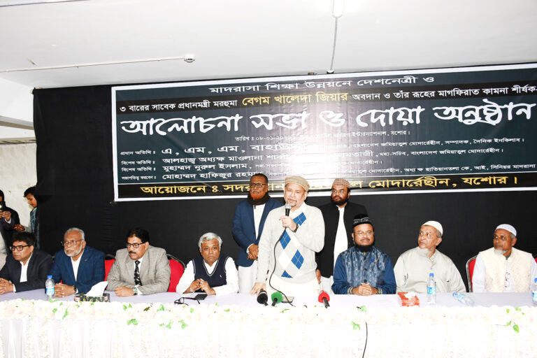 বাংলাদেশ জমিয়াতুল মোদার্রেছীন যশোর সদর উপজেলা শাখার আয়োজনে মাদ্রাসা শিক্ষার উন্নয়নে জাতীয় ঐক্যের প্রতীক, বিএনপি চেয়ারপার্সন, সাবেক তিন বারের সফল প্রধানমন্ত্রী, আপোসহীন দেশনেত্রী বেগম খালেদা জিয়ার অবদান শীর্ষক আলোচনা সভা এবং তার রুহের মাগফিরাত কামনায় দোয়া মাহফিল অনুষ্ঠিত হয়েছে।