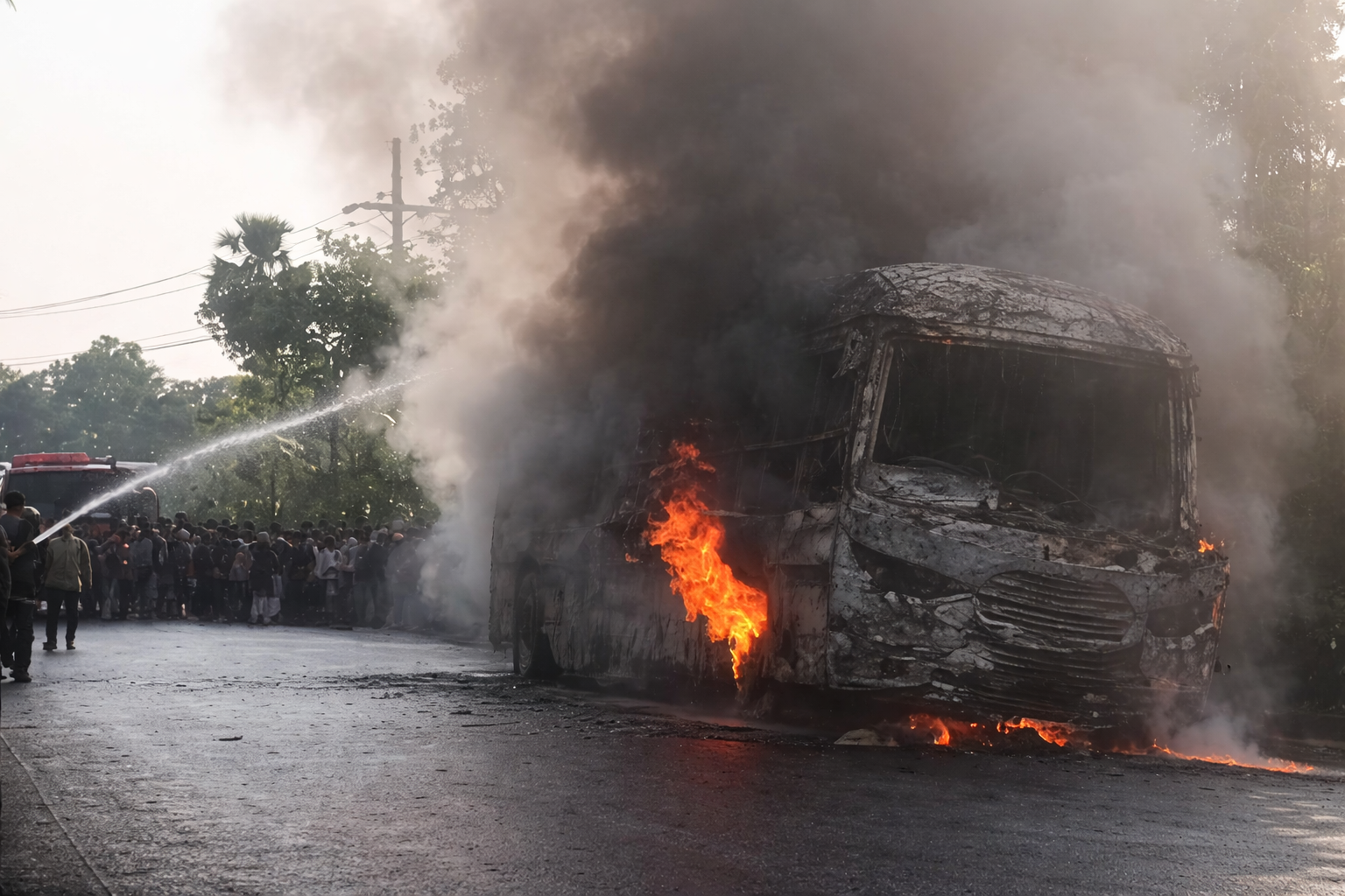 আব্বাস আলী নামে অন্য একজন স্থানীয় বাসিন্দা বলেন, প্রায় ৪০ মিনিট ধরে বসেটি আগুনে পুড়েছে। ফায়ার সার্ভিস এসে আগুন নিয়ন্ত্রণ করে। বাসে থাকা যাত্রীরা অক্ষত। তবে দরজা জানালা দিয়ে বের হতে গিয়ে অনেকে হাত পায়ে আঘাত পেয়েছে। কারো কারো হাত কেটেও গেছে।