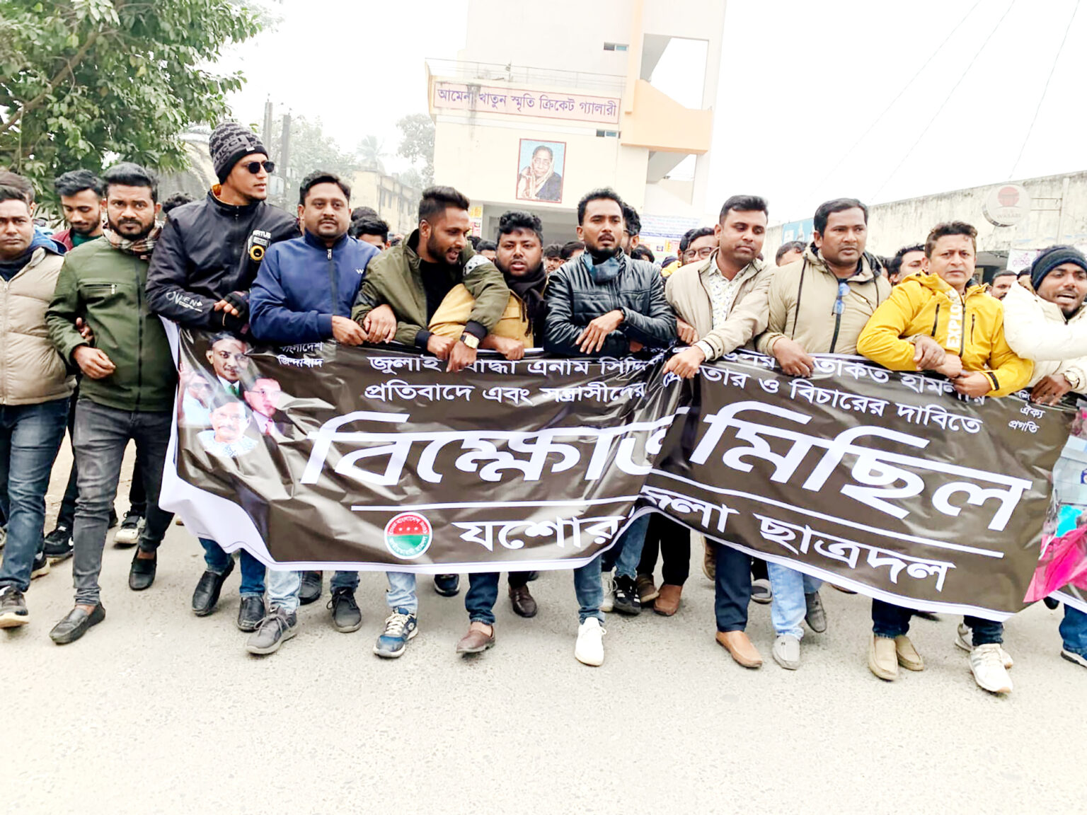 জুলাই গণঅভ্যুত্থানে অংশগ্রহণকারী ছাত্র-শ্রমিক-জনতার ওপর হামলা ও মিথ্যা মামলা বন্ধের দাবিতে বিক্ষোভ মিছিল করেছে বৈষম্যবিরোধী ছাত্র আন্দোলন যশোর জেলা শাখা। রোববার বিকালে যশোরের দড়াটানা (জুলাই চত্বর) থেকে বিক্ষোভ মিছিলটি শুরু হয়।