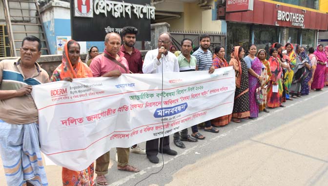 আন্তর্জাতিক বর্ণ বৈষম্য বিলোপ দিবস উপলক্ষে যশোরে মানববন্ধন কর্মসূচি পালন করেছে বাংলাদেশ দলিত ও বঞ্চিত জনগোষ্ঠী অধিকার আন্দোলন (বিডিইআরএম), যশোর জেলা শাখা।