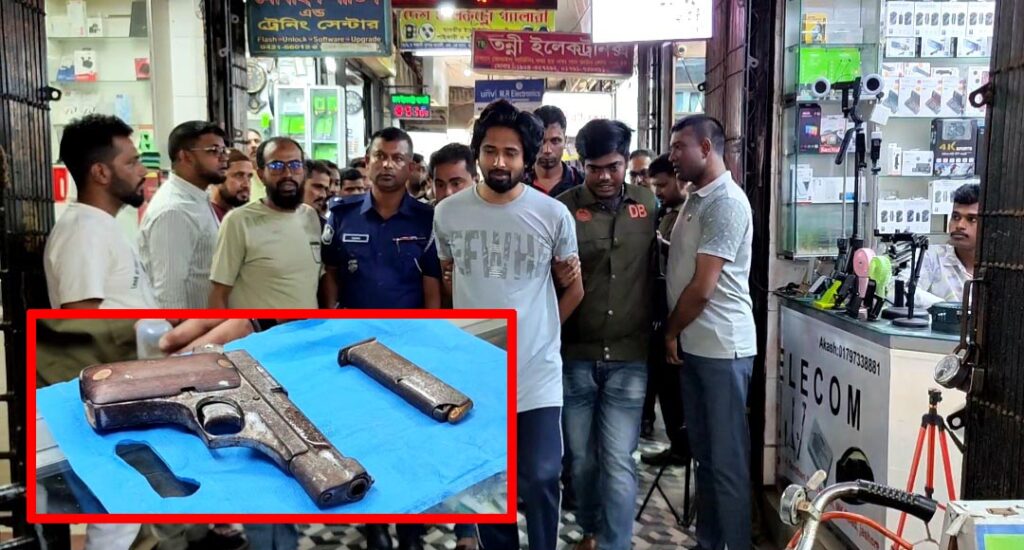 যশোর শহরের সন্ধানী সুপারমার্কেটে অভিযান চালিয়ে একটি মোবাইল মেরামতের দোকান থেকে বিদেশি পিস্তল, ম্যাগাজিন, গুলিসহ এক দোকান মালিককে আটক করেছে জেলা গোয়েন্দা শাখা (ডিবি) পুলিশ।