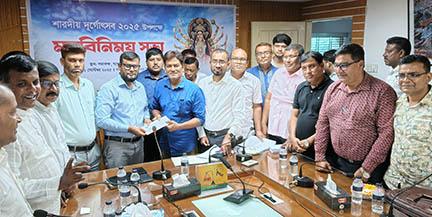 মতবিনিময় সভা শেষে, পৌরসভার পক্ষ থেকে পৌর এলাকার ৪৫টি পূজা মণ্ডপের প্রত্যেককে ৬ হাজার টাকা করে মোট ২ লাখ ৭০ হাজার টাকার অনুদান চেক বিতরণ করা হয়।