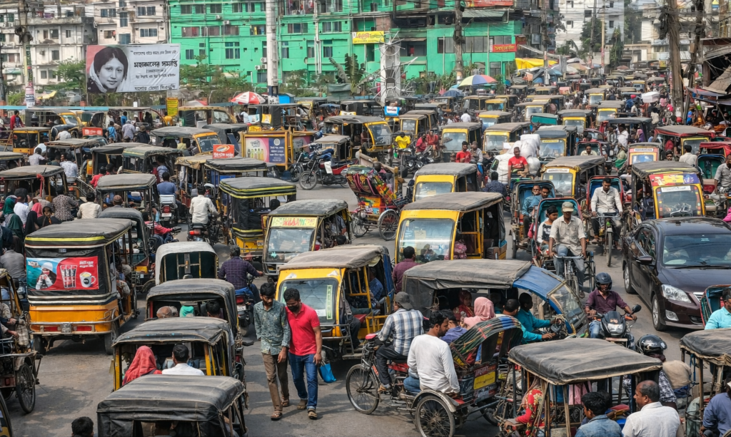 তৈয়ব মোল্লা নামে এক রিকসা চালক বলেন, ‘ভিড়ের ভিতরে রিকসা চালাতে কষ্ট হয়। বেশিক্ষণ জ্যামে আটকা থাকাতে ব্যাটারির চার্জ কমে যায়। প্রত্যেক দিন শহরে জ্যাম। এতে ভাড়াও পাওয়া যাচ্ছে না।’