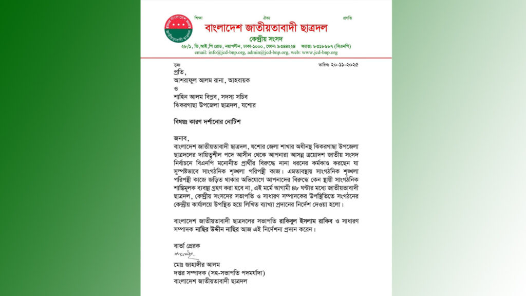 জাতীয়তাবাদী যুবদলের কেন্দ্রীয় সহদপ্তর সম্পাদক মিনহাজুল ইসলাম ভুঁইয়া স্বাক্ষরিত চিঠিতে বলা হয়েছে, মোনাজ্জেল হোসেন লিটন ও আরাফাত হোসেন কমল উপজেলা ও পৌর যুবদলের গুরুত্বপূর্ণ পদে আসীন থাকার পরও জনসম্মুখে আসন্ন ত্রয়োদশ জাতীয় সংসদ নির্বাচন উপলক্ষে বাংলাদেশ জাতীয়তাবাদী দল বিএনপি মনোনীত ধানের শীষের প্রার্থীর বিরুদ্ধাচরণ করছেন মর্মে যুবদল কেন্দ্রীয় নির্বাহী কমিটির দৃষ্টিগোচর হয়েছে। সংগঠনের শৃংখলা বিনষ্টকারী এহেন কর্মকাণ্ডের জন্য আপনাদের বিরুদ্ধে কেন সাংগঠনিক ব্যবস্থা গ্রহণ করা হবে না, তা আগামী তিন দিনের মধ্যে কেন্দ্রীয় নির্বাহী কমিটির সভাপতি ও সাধারণ সম্পাদকের সামনে উপস্থিত হয়ে বাখ্যা দেয়ার নির্দেশ দেয়া হল।’ এর আগে ২০ নভেম্বর কেন্দ্রীয় ছাত্রদলের দপ্তর সম্পাদক জাহাঙ্গীর আলমের স্বাক্ষরিত বিজ্ঞপ্তিতে ঝিকরগাছা ছাত্রদলের আহ্বায়ক আশরাফুল আলম রানা ও সদস্য সচিব শাহিন আলম বিপ¬বকে শোকজ কর হয়। চিঠিতে উলে¬খ করা হয়, উপজেলা ছাত্রদলের দায়িত্বশীল পদে আসীন থেকে আপনারা ত্রয়োদশ জাতীয় সংসদ নির্বাচনে বিএনপির মনোনীত প্রার্থীর বিরুদ্ধে নানা কর্মকান্ড করছেন। যা সুস্পষ্টভাবে সাংগঠনিক শৃঙ্খলা পরিপন্থী কাজ। এমতাবস্থায় সাংগঠনিক পরিপস্থী কাজে জড়িত থাকার অভিযোগে কেন স্থায়ী সাংগঠনিক শাস্তিমূলক ব্যবস্থা গ্রহণ করা হবে না এই মর্মে আগামী ৪৮ ঘন্টার মধ্যে ছাত্রদলের কেন্দ্রীয় কমিটির সভাপতি-সম্পাদকের উপস্থিতিতে সংগঠনের কার্যালয়ে উপস্থিত হয়ে লিখিতভাবে ব্যাখা প্রদানের নির্দেশ দেওয়া হলো।’