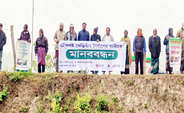 বাগেরহাটের শরণখোলায় বেসরকারি উন্নয়ন সংস্থা উদয়ন বাংলাদেশের সহযোগিতায় শরণখোলা বাজার সংলগ্ন খুড়িয়াখালী গ্রামবাসীর আয়োজনে তিন কিলোমিটার টেকসই বেড়িবাঁধের দাবিতে মানববন্ধন অনুষ্ঠিত হয়েছে।