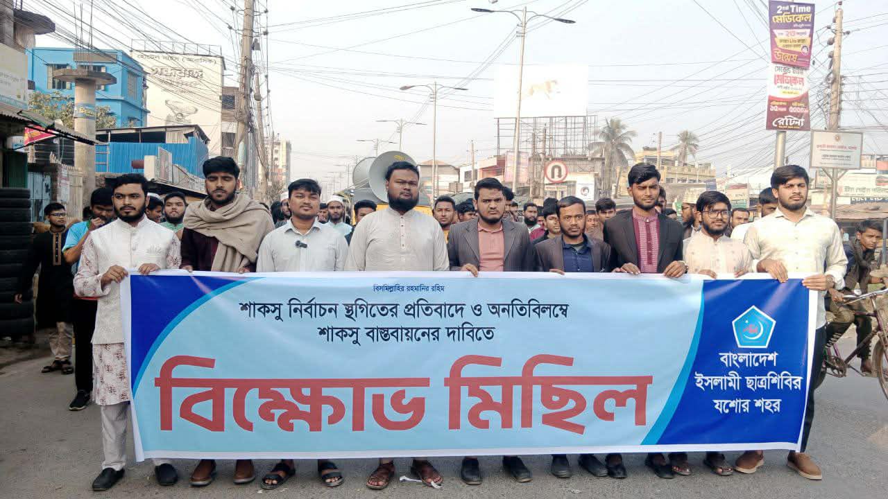 শাহজালাল বিজ্ঞান ও প্রযুক্তি বিশ্ববিদ্যালয়ের কেন্দ্রীয় ছাত্র সংসদ (শাকসু) নির্বাচন স্থগিতের প্রতিবাদে এবং অনতিবিলম্বে নির্বাচন বাস্তবায়নের দাবিতে যশোরে বিক্ষোভ মিছিল করেছে বাংলাদেশ ইসলামি ছাত্রশিবির।