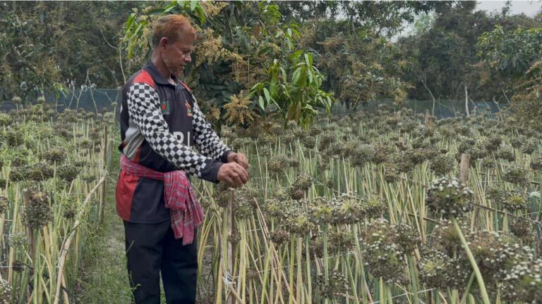 যশোরের শার্শা উপজেলার বাগআঁচড়া ইউনিয়নের সামটা গ্রামের কৃষক ইউসুফ আলী প্রথমবারের মতো পেঁয়াজের বিজ উৎপাদন করেছেন। পেঁয়াজের ফুলে ফুলে ভরে গেছে পুরো ক্ষেত। আর কিছুদিনের মধ্যেই এই ফুল থেকে সংগ্রহ করা হবে বিজ। তাই ক্ষেতের পরিচর্যায় এখন ব্যস্ত সময় পার করছেন তিনি।