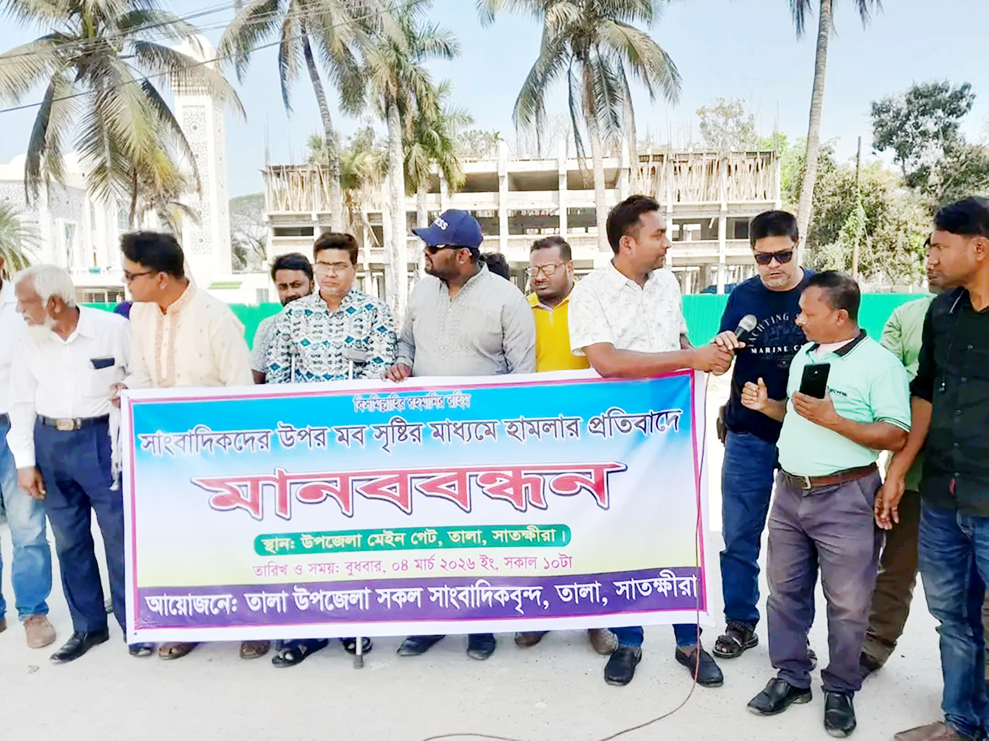 সাতক্ষীরায় সাংবাদিকদের উপরে মব সৃষ্টি করে নির্যাতনের প্রতিবাদে দোষীদের শাস্তির দাবিতে মানববন্ধন অনুষ্ঠিত হয়েছে। ৪ মার্চ সকাল দশটায় তাালা উপজেলার প্রধান ফটকের সামনে উপজেলায় কর্মরত সাংবাদিকদের সকল ইউনিটের সম্মিলিত আয়োজনে এ মানববন্ধন অনুষ্ঠিত হয়।