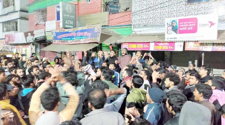 “মুজিববাদ মুর্দাবাদ, ইনকিলাব জিন্দাবাদ”-এমন বিভিন্ন স্লোগান দেন। প্রধান ফটকের সামনে বিক্ষোভ করে পরে সংক্ষিপ্ত সমাবেশের মাধ্যমে শেষ হয় কর্মসূচি।