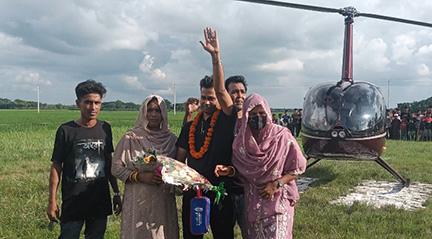 মঙ্গলবার তেমনি মা-বাবার ইচ্ছা পূরণের জন্য হেলিকপ্টারে চড়ে নিজ গ্রামে এসেছেন জিয়াউর রহমান নামে এক কুয়েত প্রবাসী। তার বাড়ি যশোরের বাঘারপাড়া উপজেলার জহুরপুর ইউনিয়নের শলুয়া গ্রামে। তিনি ওই গ্রামের উত্তরপাড়ার নুরুল ইসলামের ছোট ছেলে।