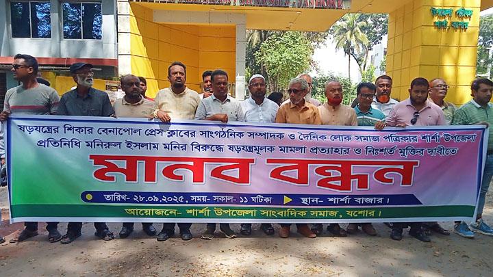 যশোরের শার্শায় ষড়যন্ত্রমূলক মিথ্যা মামলায় আটক হওয়া দৈনিক দিনকাল ও দৈনিক লোকসমাজ পত্রিকার উপজেলা প্রতিনিধি মনিরুল ইসলাম মনি’র নিঃশর্ত মুক্তি এবং মামলা প্রত্যাহারের দাবিতে মানববন্ধন অনুষ্ঠিত হয়েছে। রোববার সকাল সাড়ে ১১টায় শার্শা উপজেলা পরিষদের সামনে এ মানববন্ধন অনুষ্ঠিত।