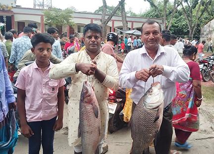 একহাতে সাড়ে ৮ কেজি ওজনের কাতলা মাছ নিয়ে হেঁটে যাচ্ছিলেন প্রদীপ কুমার বাইন। মেলা মাঠে কথা হয় তার সঙ্গে। তিনি জানালেন, ‘মেলার সামনে রাস্তায় একটি ভ্যানে বউ আর মেয়ে বসে আছে। চিনেটোলায় শ্বশুর বাড়ি। প্রতি বছর বিজয়া দশমীর দিনে শ্বশুর বাড়ি যাই। যাওয়ার সময় এই মেলা থেকে বড় মাছ নিয়ে যাই। মাছের সঙ্গে মুড়ি মুড়কি, জিলাপিও। শ্বশুর বাড়িতে আনন্দ করে সবাই চলে খাওয়া দাওয়া।’
