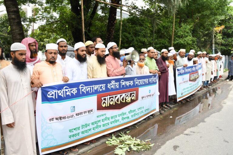 প্রাথমিক বিদ্যালয়ে ধর্মীয় শিক্ষক নিয়োগের দাবিতে যশোরে মানববন্ধন হয়েছে। শুক্রবার জমিয়তে সুব্বানে আহলে হাদীস ও আহলে হাদীস যুব সংঘের যৌথ উদ্যোগে বাদ জুম্মা যশোর প্রেসক্লাবের সামনে এ মানববন্ধন অনুষ্ঠিত হয়। আহলে হাদীস যুব সংঘের কেন্দ্রীয় কাউন্সিল সদস্য হাফেজ তরিকুল ইসলামের নেতৃত্বে এই কর্মসূচিতে শতাধিক নেতাকর্মী অংশ নেন।