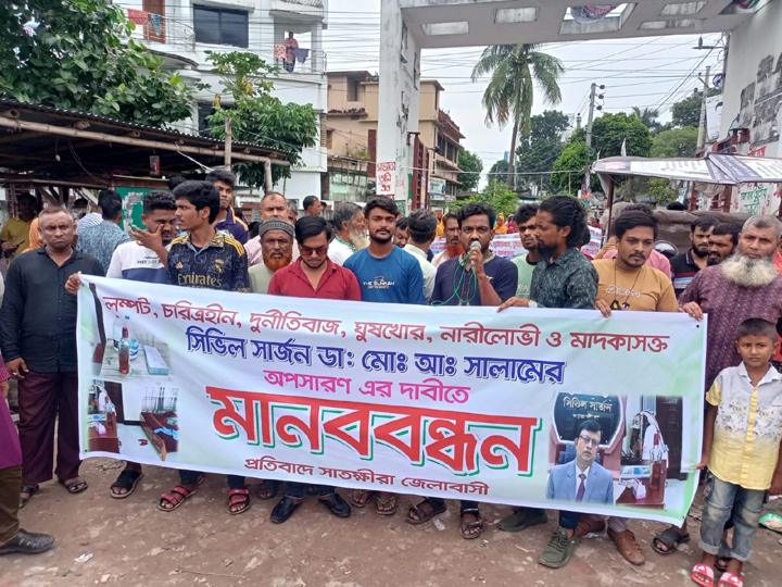 সাতক্ষীরার সিভিল সার্জন ডা. আব্দুস সালামের অপসারণ দাবিতে মানববন্ধন ও সিভিল সার্জন অফিস ঘেরাও কর্মসূচি পালন করেছে এলাকাবাসী। সোমবার বেলা ১১টায় শহরের খুলনা মোড়ে “সাতক্ষীরা জেলাবাসী” ব্যানারে এ মানববন্ধন অনুষ্ঠিত হয়। এতে সভাপতিত্ব করেন জেলা ভূমিহীন সমিতির সভাপতি কওসার আলী এবং সঞ্চালনা করেন জেলা নদী, বন ও পরিবেশ রক্ষা কমিটির সাধারণ সম্পাদক মফিজুর রহমান।